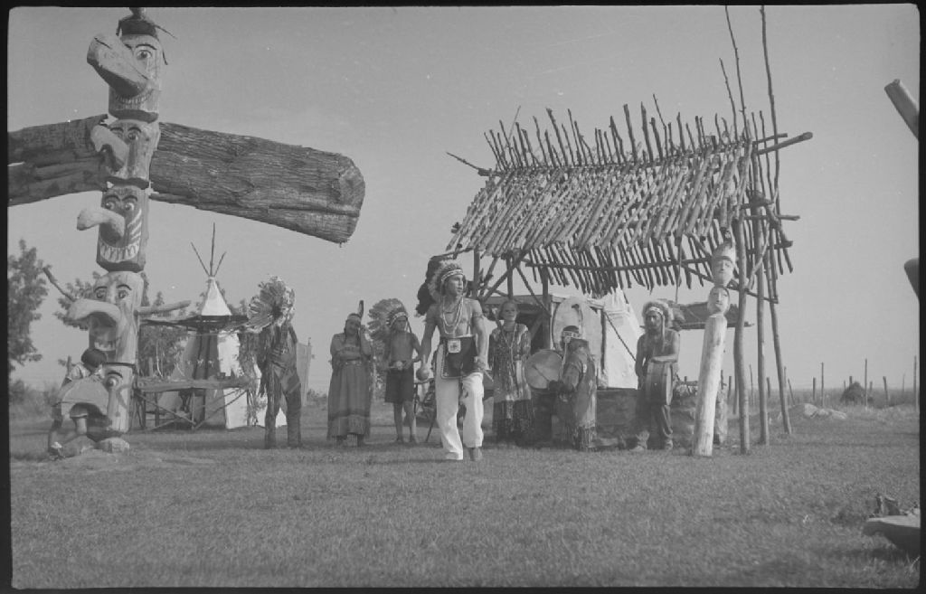 Groupe d'amérindiens en costume traditionnel exécutant une danse au rythme des tambours. Nous apercevons le totem des Six Nations ainsi qu'un abri de branches, un tipi sur la place où se déroule la cérémonie, à la réserve indienne de Caughnawaga