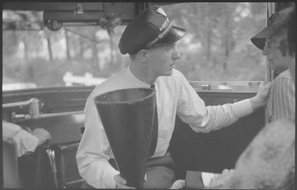 Intérieur d'un autobus où un guide touristique en uniforme, tenant un porte-voix à la main, donne des explications à une touriste