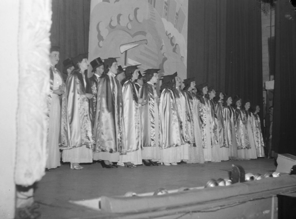 Les acteurs de la revue Bleu et or présentée à l'Université de Montréal se tiennent sur la scène. Les femmes portent la toge et le mortier tandis que les hommes ont le haut-de-forme et le smoking