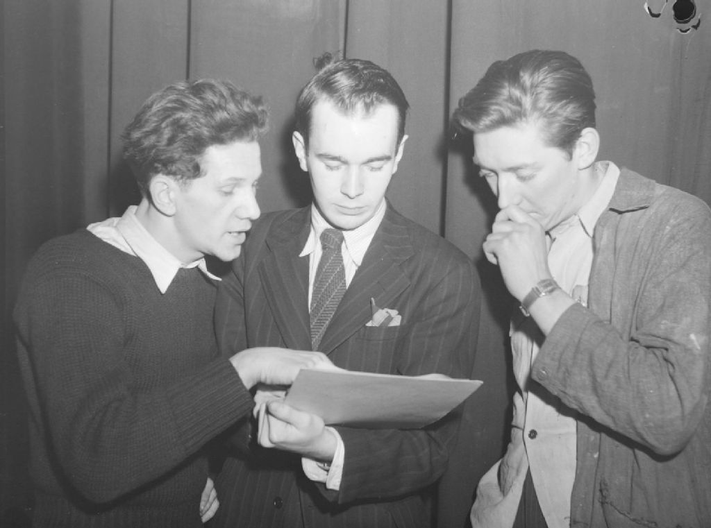 Nous voyons Roger Garand, Jacques Hébert et René L. Caron, respectivement directeur, conseiller et décorateur de la revue Bleu et or présentée à l'Université de Montréal
