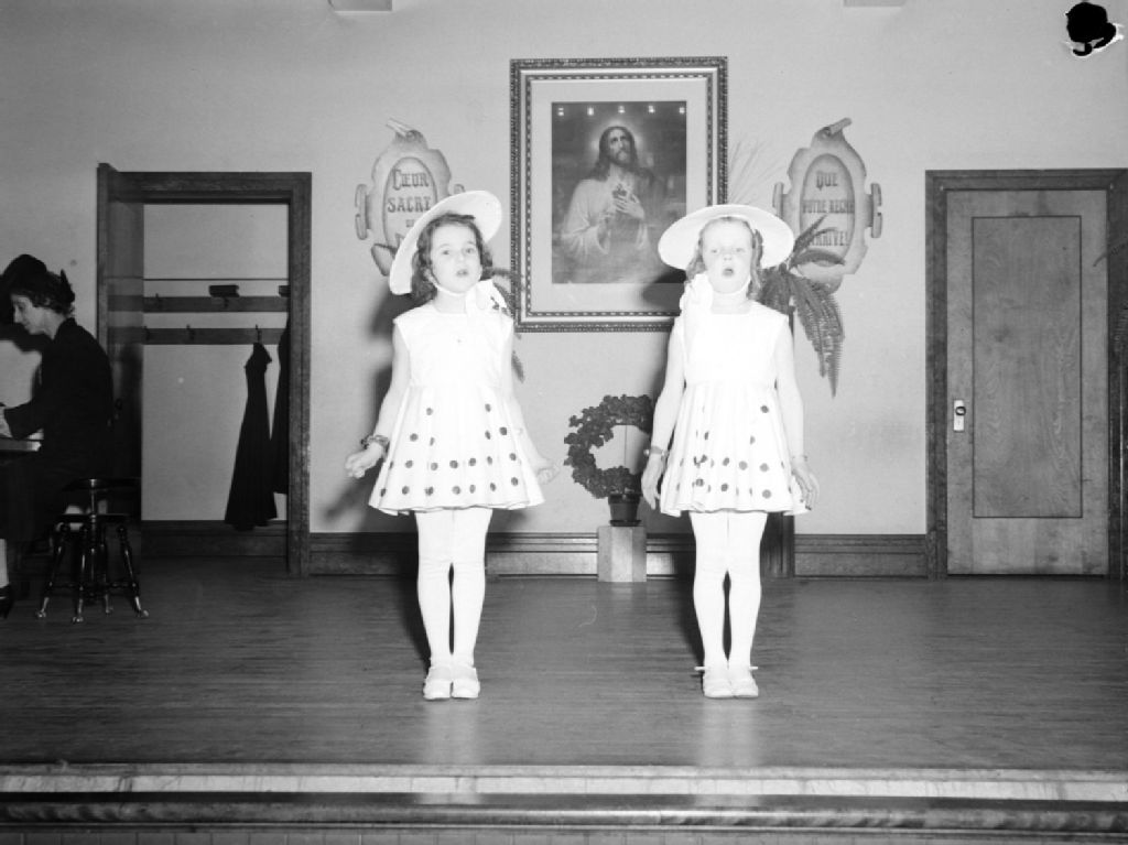 Mesdemoiselles Tousignant et Maynard, des élèves des cours d'élocution et de théâtre à l'école Petit-Monde de madame Yvonne Audet (née Duckett), disent une récitation sur une scène