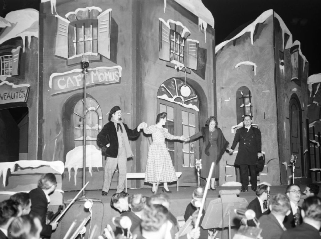 Nous voyons quatre chanteurs et quelques musiciens de l'orchestre lors d'une représentation de l'opéra «La Bohème» de Puccini au stade Percival-Molson de l'Université McGill