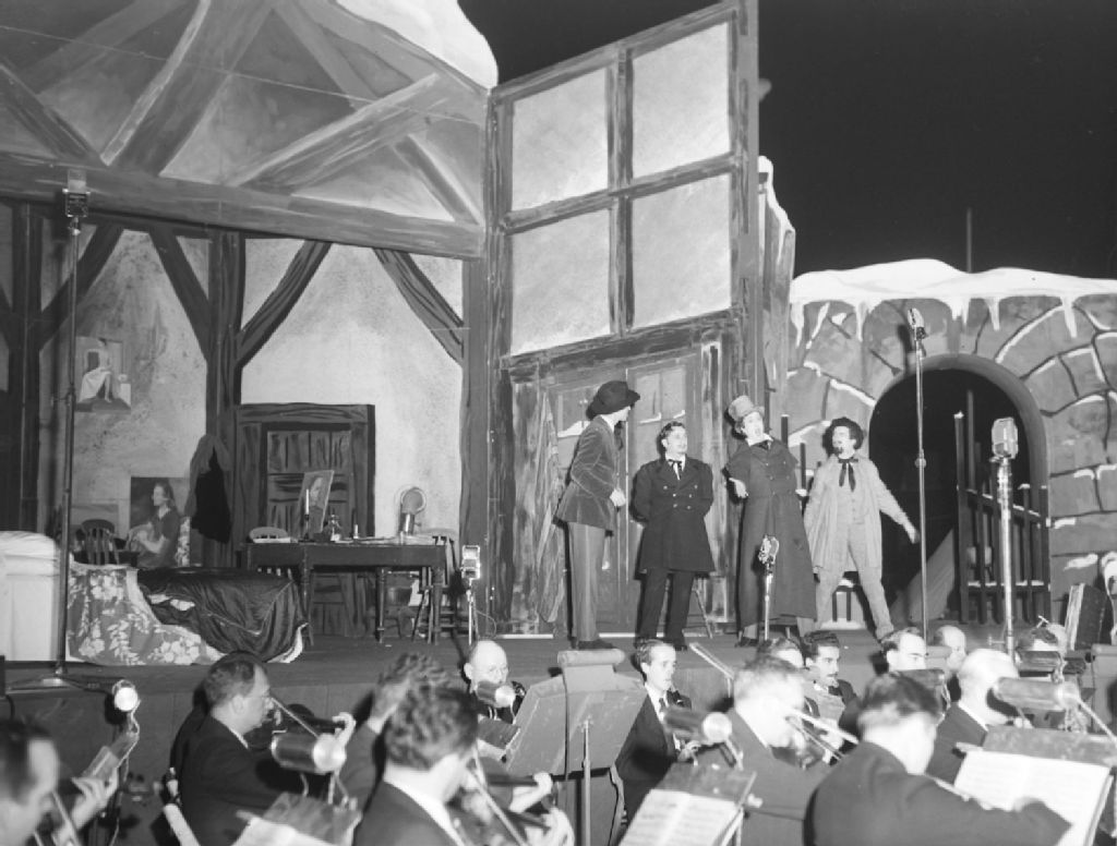 Nous voyons des chanteurs et des musiciens de l'orchestre lors d'une représentation de l'opéra «La Bohème» de Puccini au stade Percival-Molson de l'Université McGill