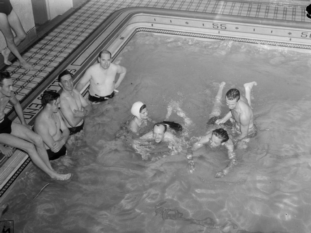 Un groupe d'hommes, guidé par un moniteur et une monitrice, apprend à nager dans la piscine de la Young Men's Christian Association de Notre-Dame-de-Grâce