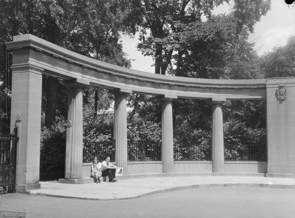Nous voyons la clôture en fer forgé et les colonnes, appelées «portes Roddick», qui marquent l'entrée du campus du centre-ville de l'Université McGill à Montréal