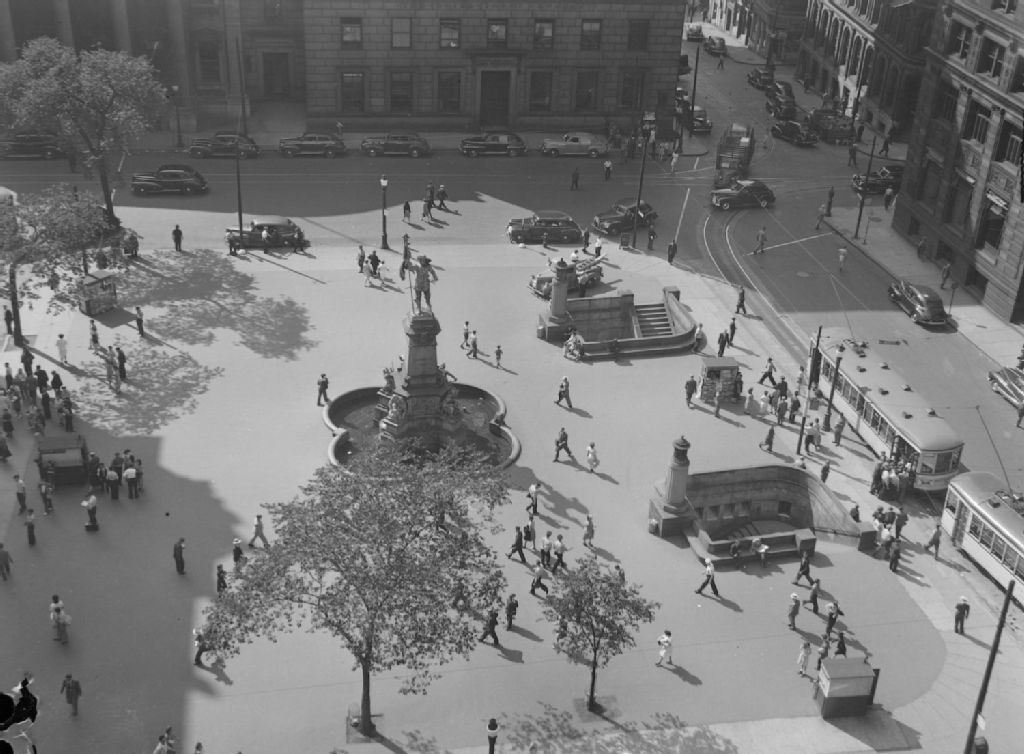 Nous voyons la place d'Armes avec le monument de Paul Chomedey de Maisonneuve, des entrées de vespasiennes, des voitures et des tramways