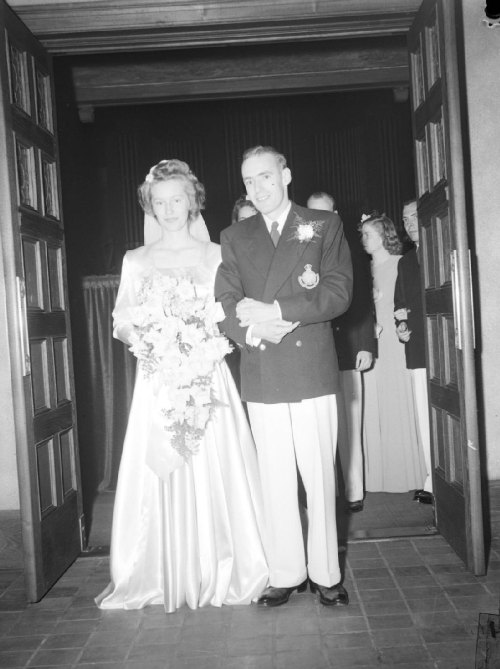 Les nouveaux mariés, Mariam Steele et Wilfred Wallace, se tiennent à la sortie de l'église où leur mariage a été célébré. Monsieur Wallace porte un veston croisé avec un écusson du Collège militaire royal sur la pochette
