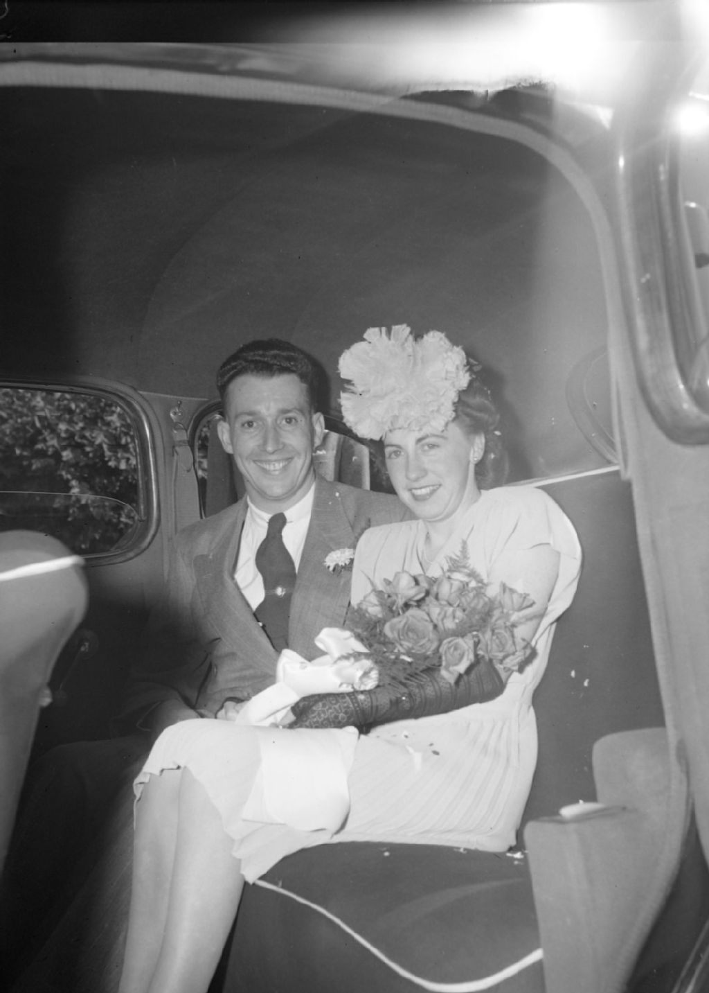 Les nouveaux mariés, Anna Cowan et Douglas Webb, sont assis sur la banquette arrière d'une voiture