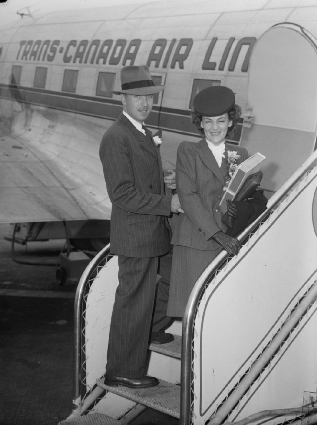Les nouveaux mariés, madame Yvette Villebon et son mari, sont sur les marches de l'escalier d'accès d'un avion de Trans-Canada Air Lines