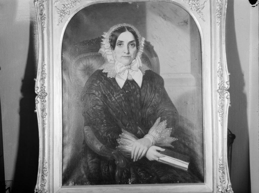 Nous voyons un portrait de face représentant une dame. Cette peinture est encadrée