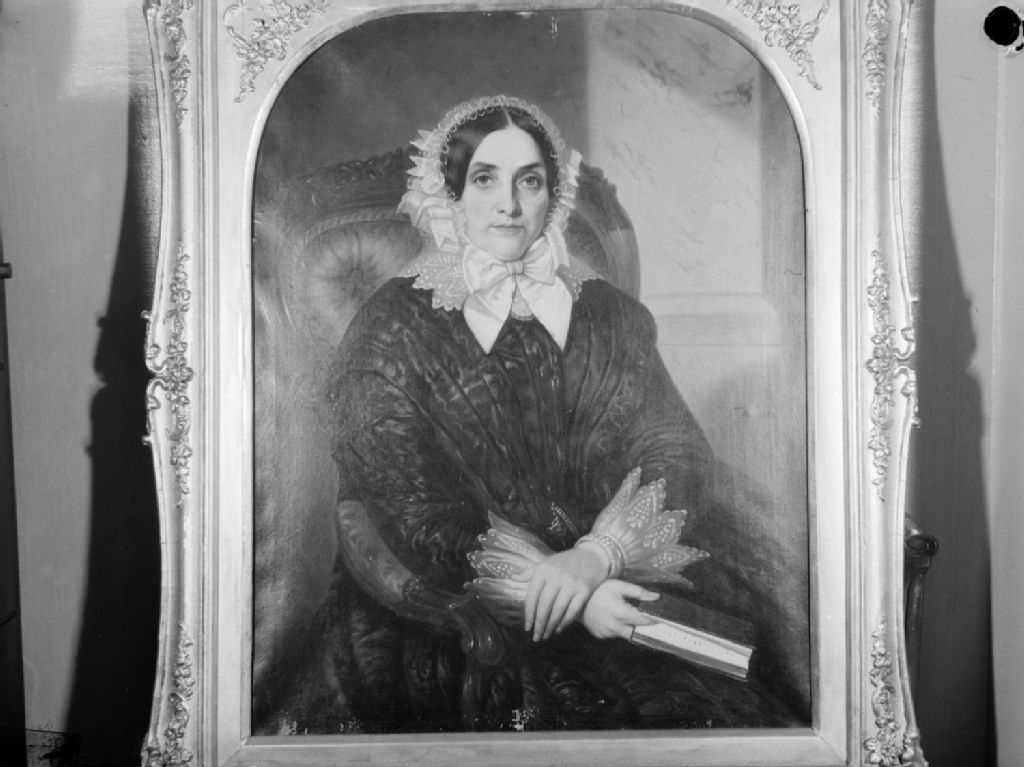 Nous voyons un portrait de face représentant une dame. Cette peinture est encadrée