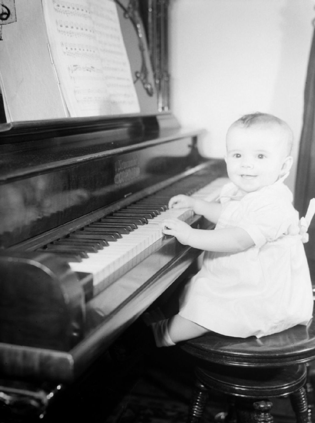 Nous voyons le bébé Shirley Chrenicle taper sur les notes du piano