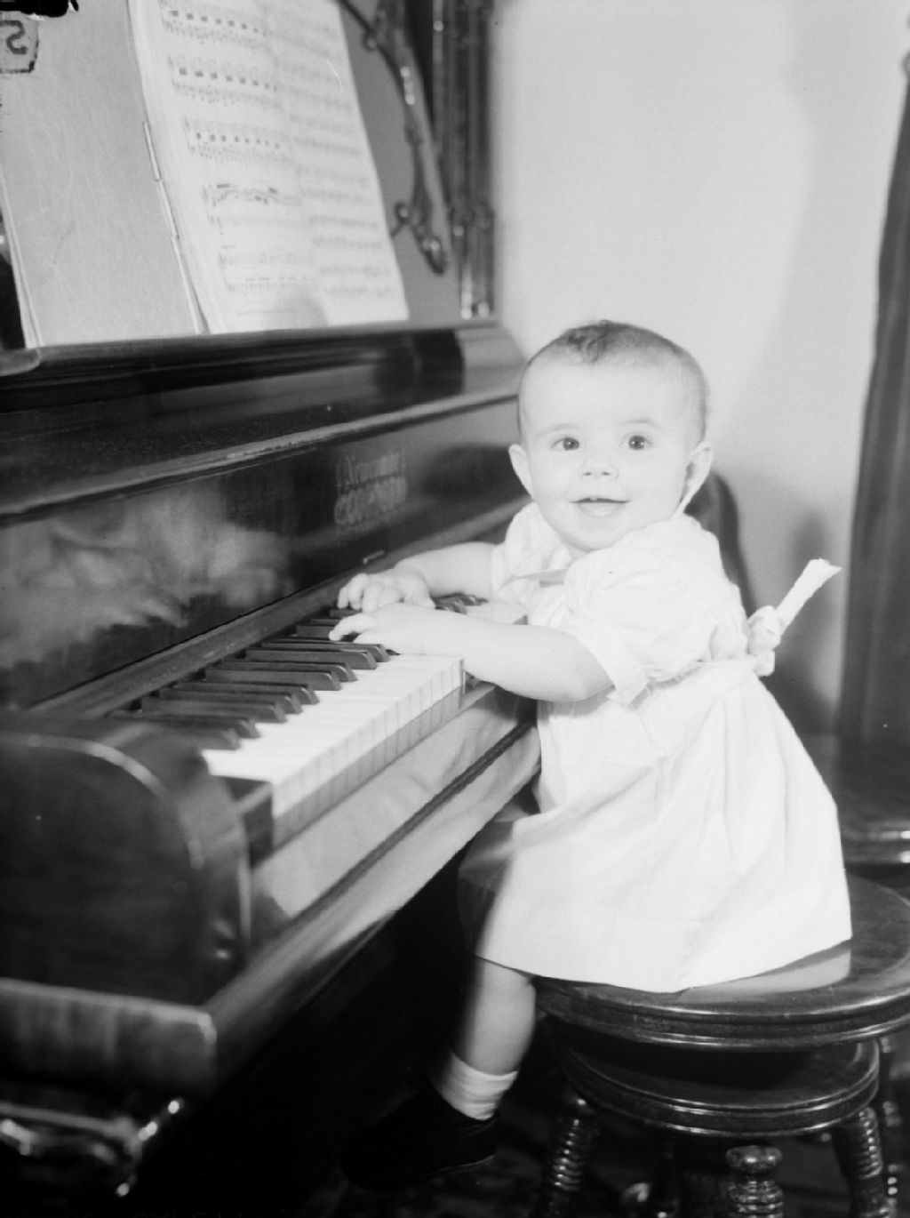 Nous voyons le bébé Shirley Chrenicle taper sur les notes du piano