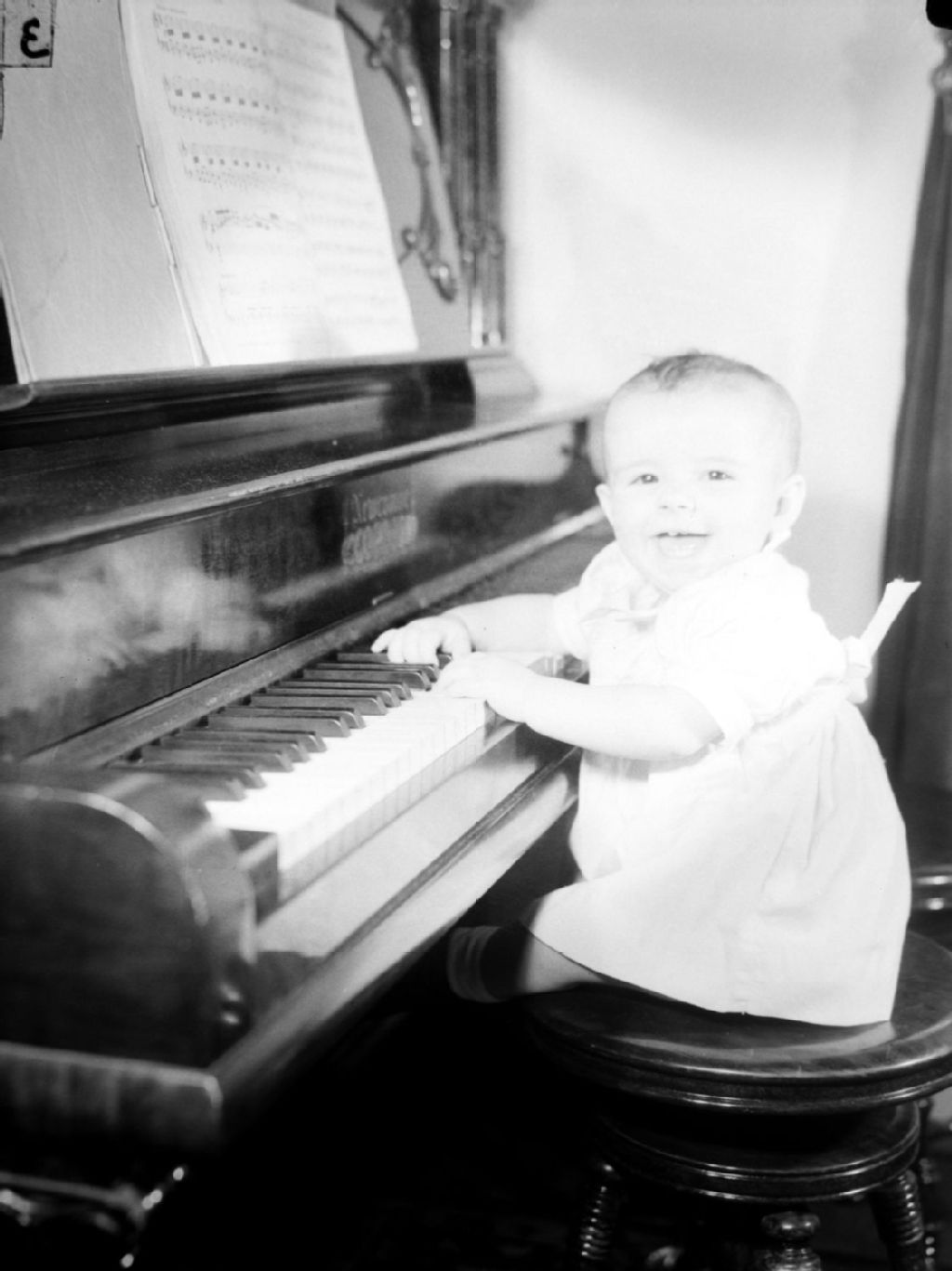 Nous voyons le bébé Shirley Chrenicle taper sur les notes du piano