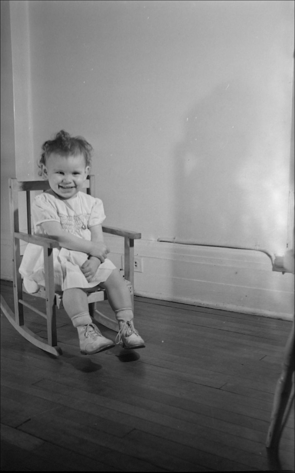 La petite fille de madame M. S. Burns se berce dans une chaise berçante