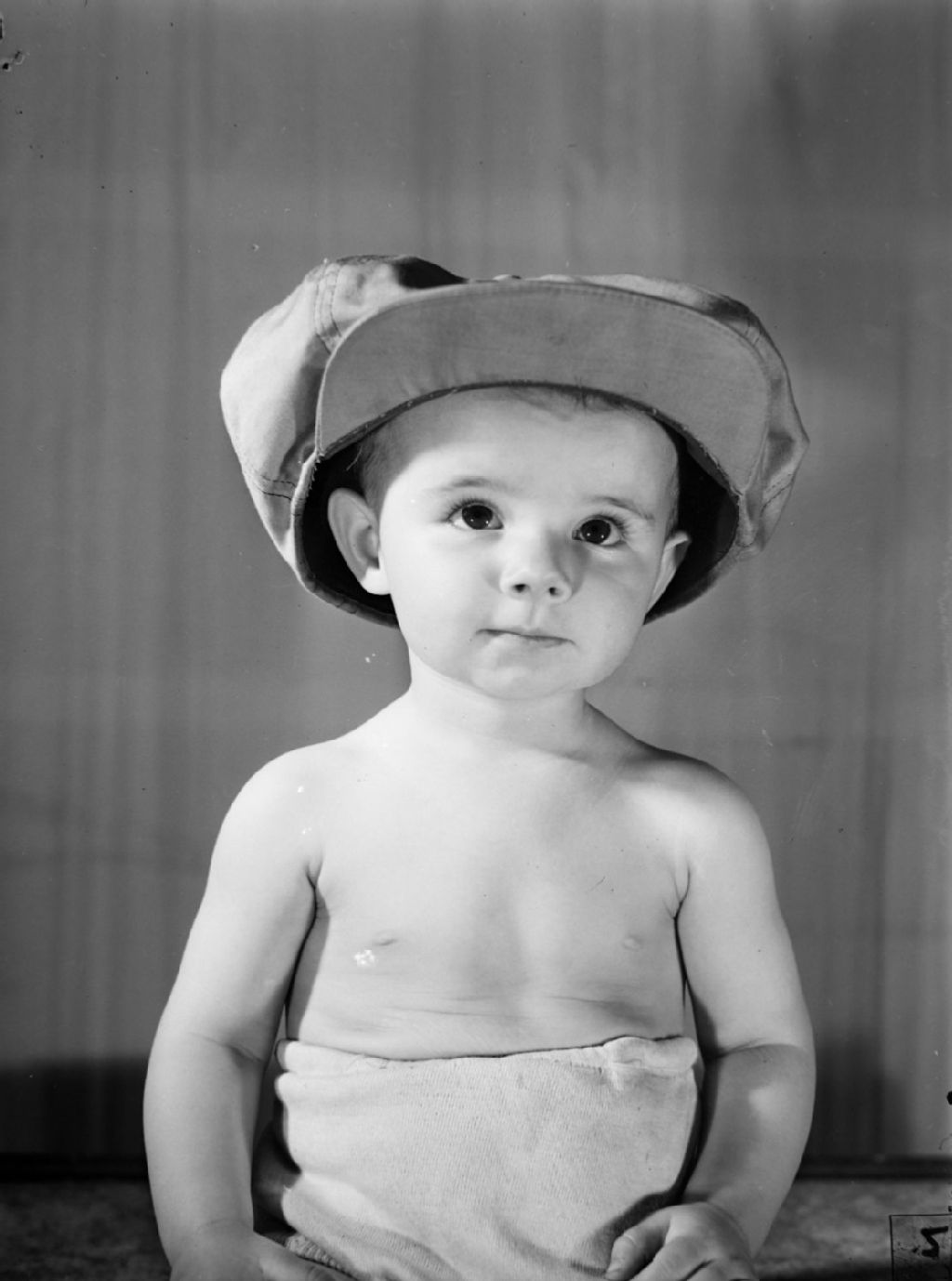 Le bébé Shirley Chrenicle, en couche-culotte, est coiffée d'une casquette d'adulte
