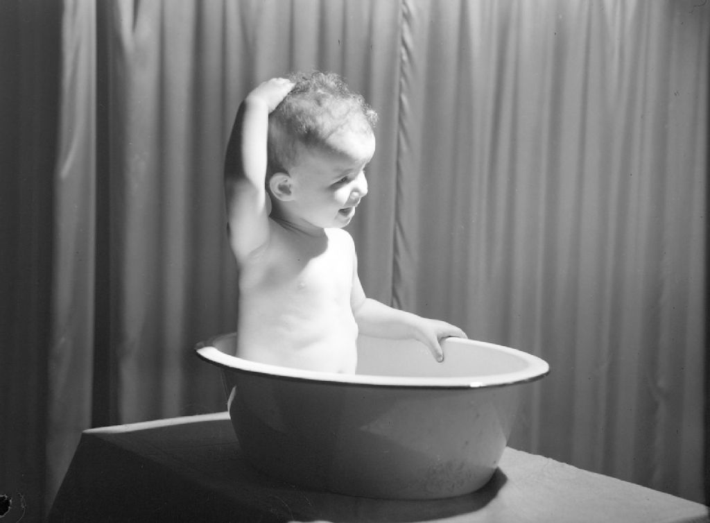 Le bébé Shirley Chrenicle prend un bain dans une cuvette de métal installée sur une table