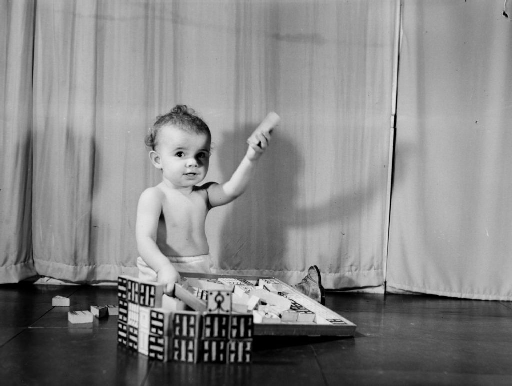 Le bébé Shirley Chrenicle, en couche-culotte et chaussée de bottines, est assise sur le plancher et joue avec les pièces d'un jeu de cubes