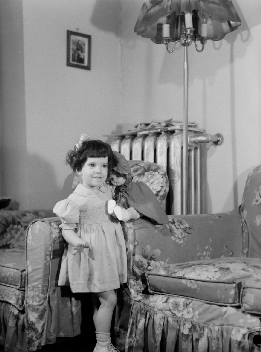 Au salon, Lynn McCullough tient sa poupée dans ses bras. Derrière elle, se trouve un calorifère