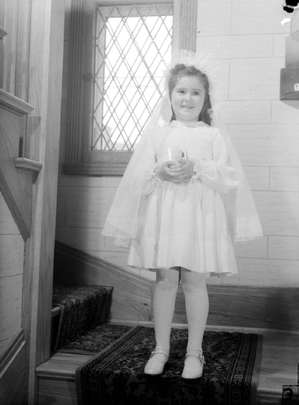 Suzanne Robert porte le voile des premières communiantes et tient contre elle un missel