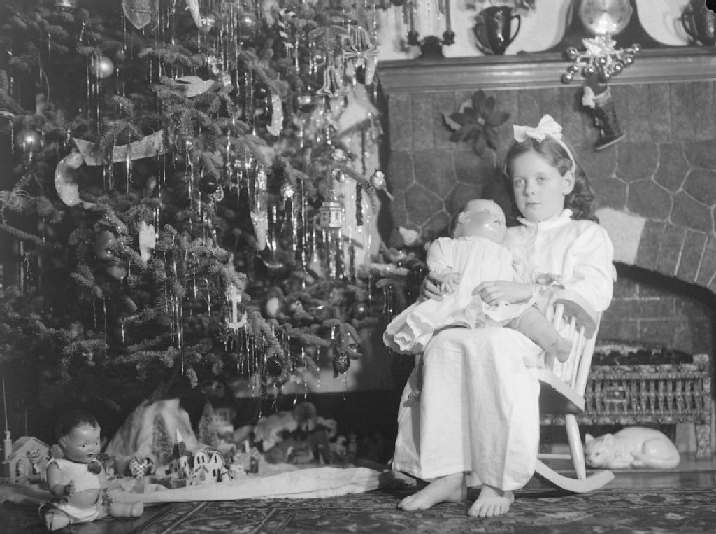 Pierrette assise dans une berceuse avec sa poupée. À proximité, se trouvent le foyer et l'arbre de Noël