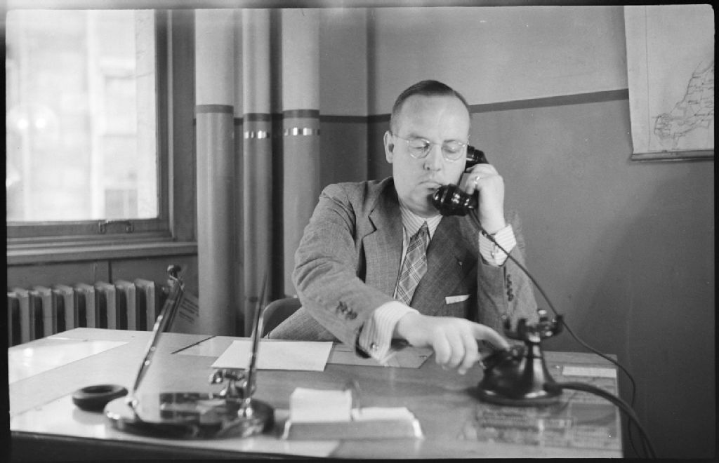 Nous voyons un homme assis à un bureau et parlant au téléphone. Nous remarquons son porte-plumes sur son bureau et le système de chauffage à eau chaude avec le radiateur à colonnes