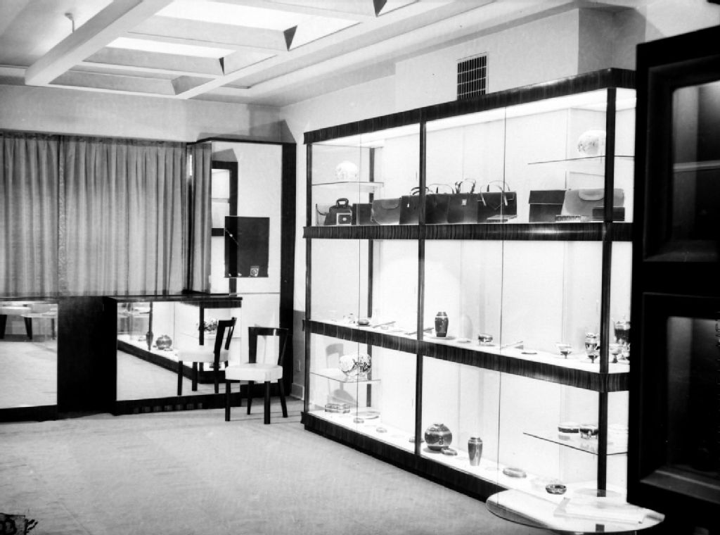 Vitrines où sont exposées des vases ornementaux, un service à thé et des sacs à main. Il s'agit de la joaillerie Gabriel L. Lucas de la rue Sherbrooke à Montréal