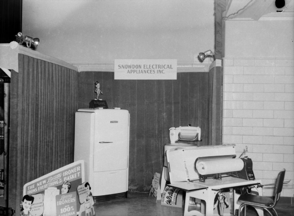 Kiosque du commerce Snowdon Electrical Appliances où l'on remarque un réfrigérateur, une laveuse à tordeur et une repasseuse