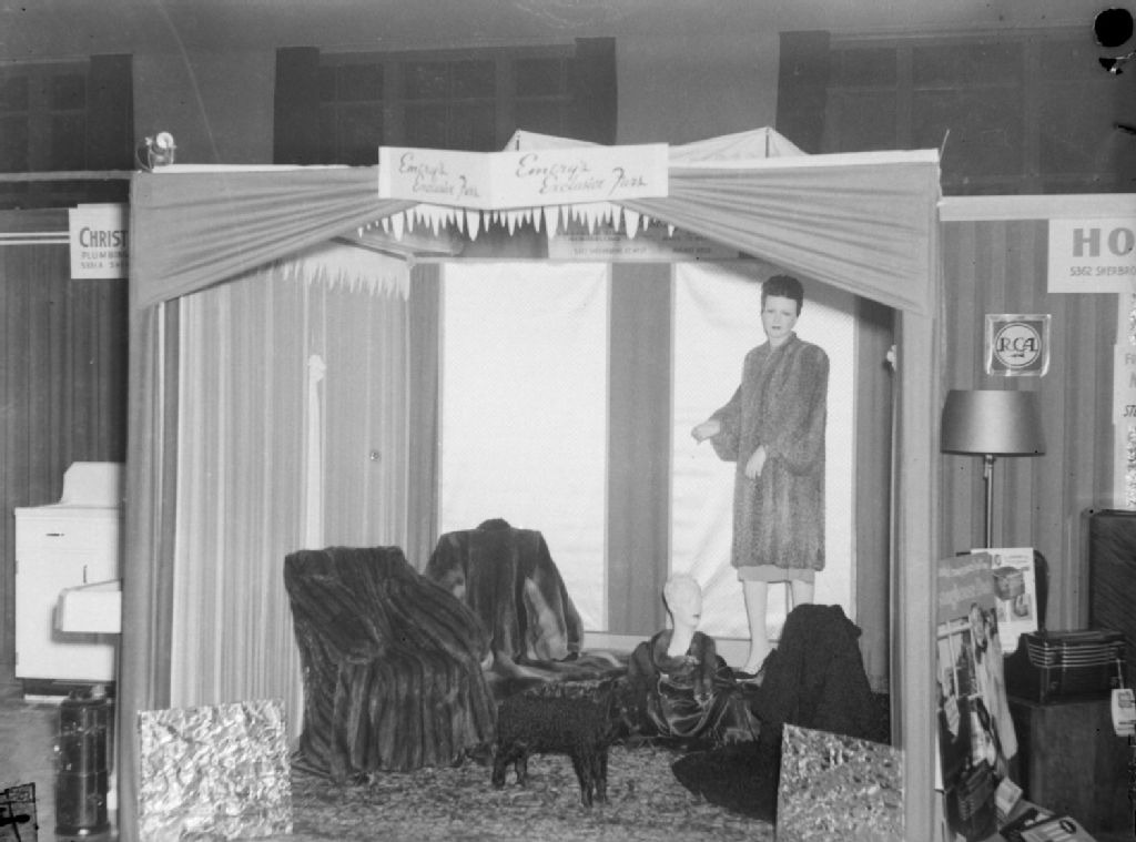 Stand du magasin Emery's Exclusive Furs situé sur la rue Sherbrooke Ouest à Montréal. Parmi les fourrures en montre, on remarque des pelisses en mouton de Perse et des collets de renard