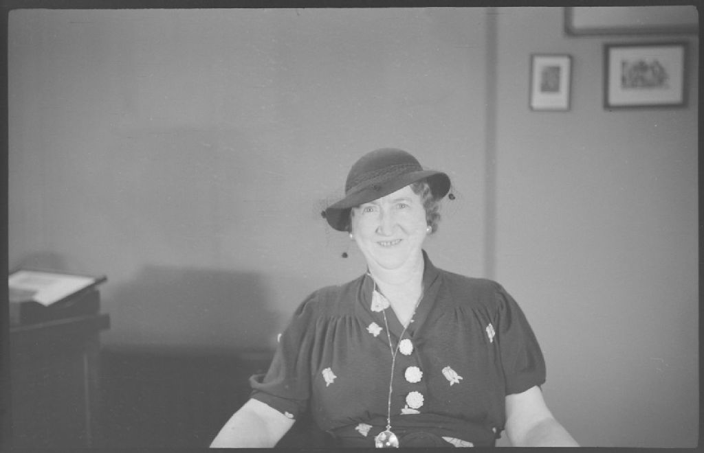 À la Bell Telephone Pioneer Convention, nous voyons une femme assise. Elle est vêtue d'une robe et est coiffée d'un chapeau à voilette. Nous remarquons son médaillon