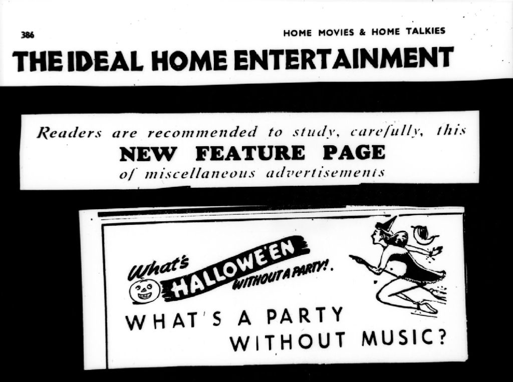 Annonces publicitaires : «the Ideal Home Entertainment, «New Feature Page», «What's Hallowe'en without a party»
