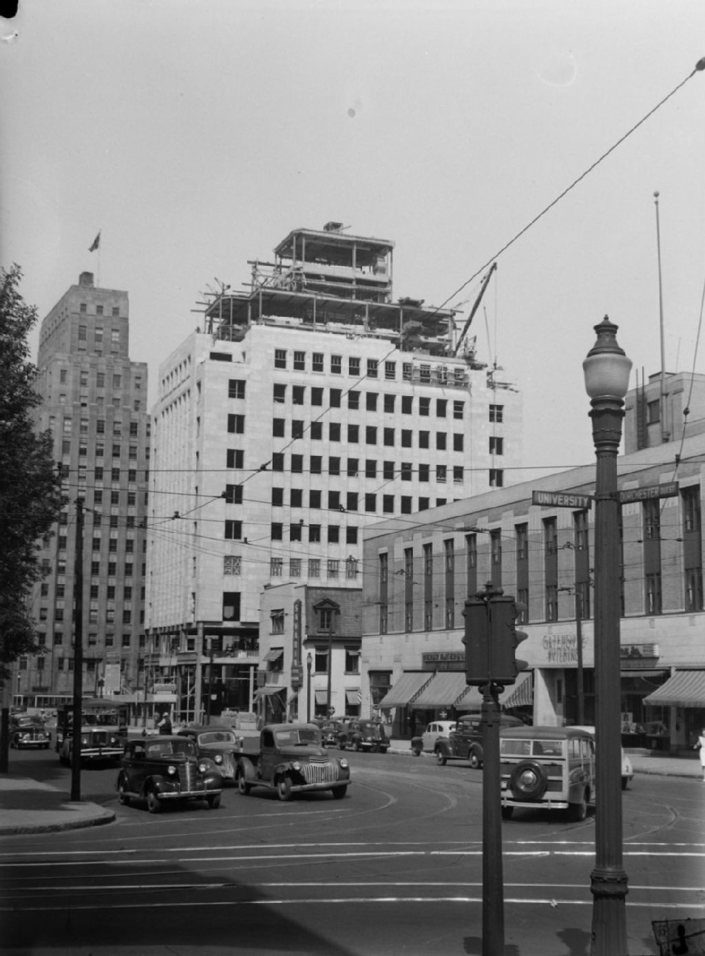 Immeuble en construction de la Shawinigan Water and Power Company sur le boulevard Dorchester devenu le René-Lévesque à Montréal