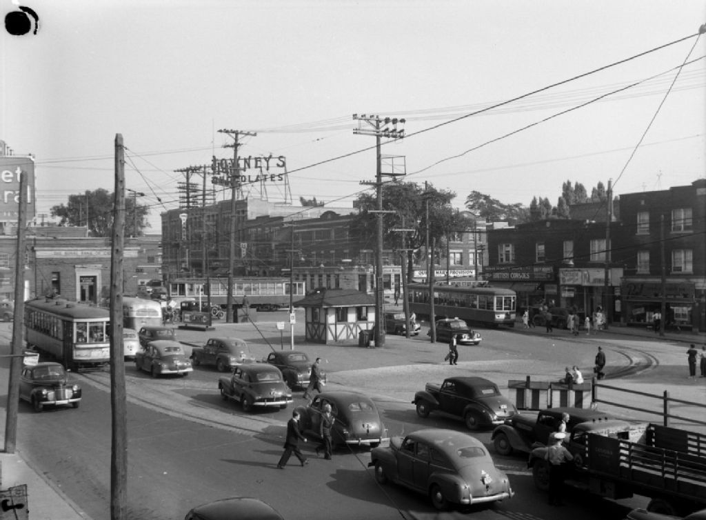 Circulation automobile composée de tramways électriques, de voitures et d'un autobus. Nous présumons qu'il s'agit de l'intersection chemin Queen Mary et Décarie à Montréal