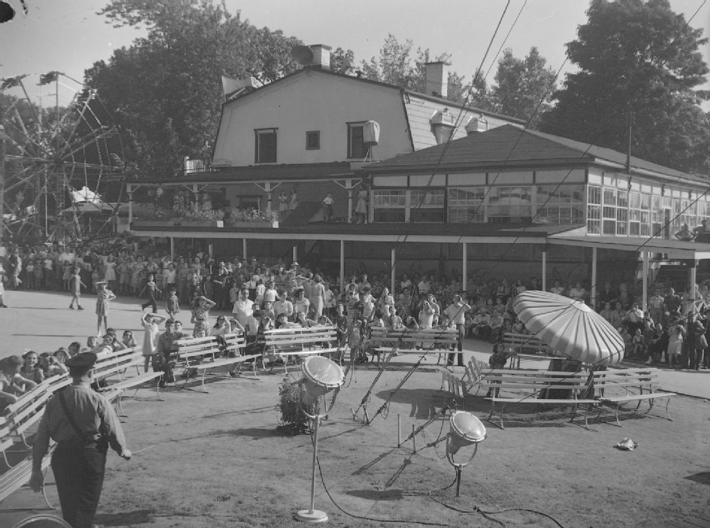 Bâtiment du parc Belmont à Montréal. Nous remarquons la foule et le manège de la grande roue