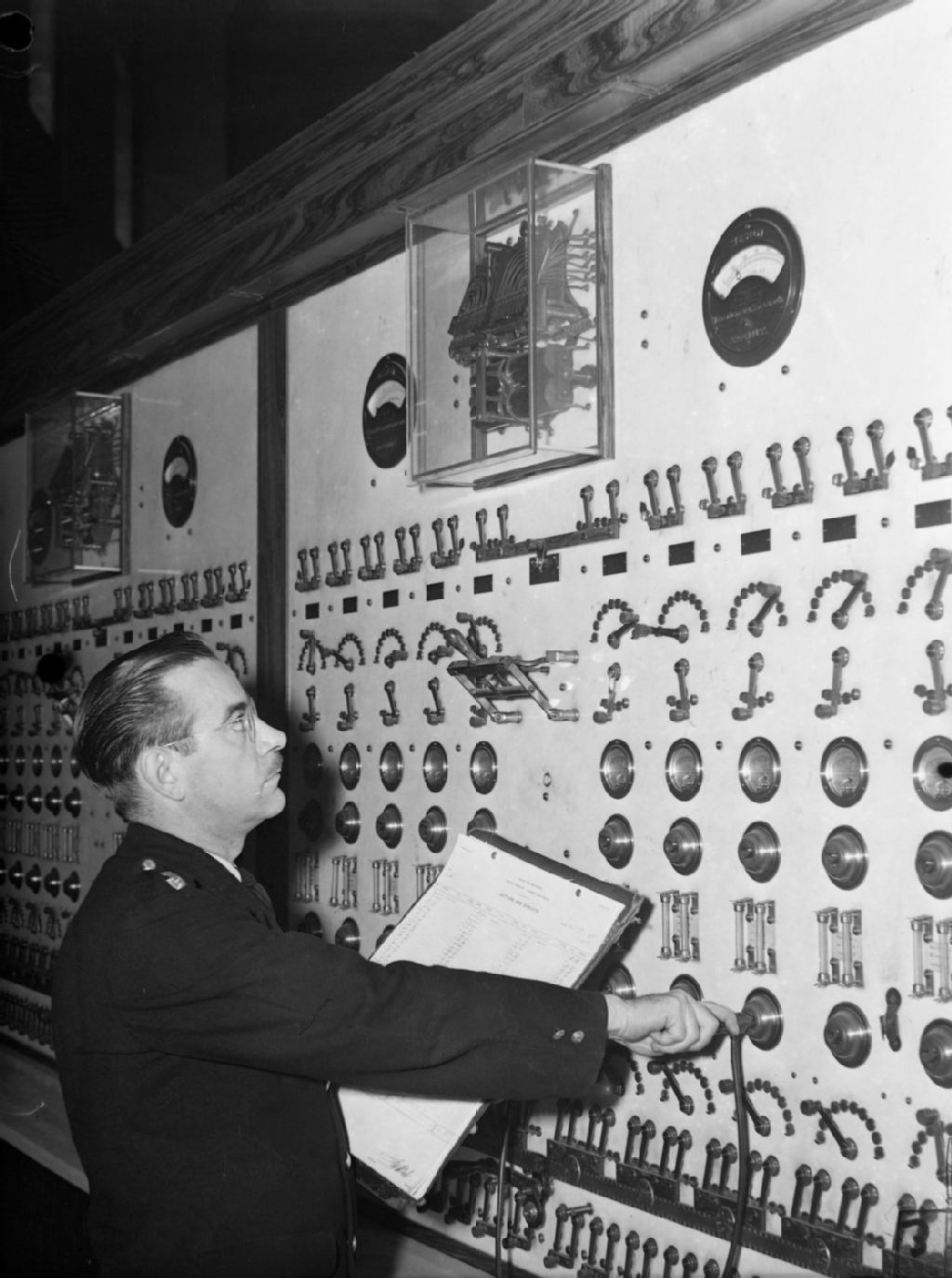 Feature. P. Lanthier. Operator in Charge. Checking Circuits of Alarm Boxes, 15 septembre 1947, Archives nationales à Montréal, Fonds Conrad Poirier, (06M,P48,S1,P15171), Poirier, Conrad.