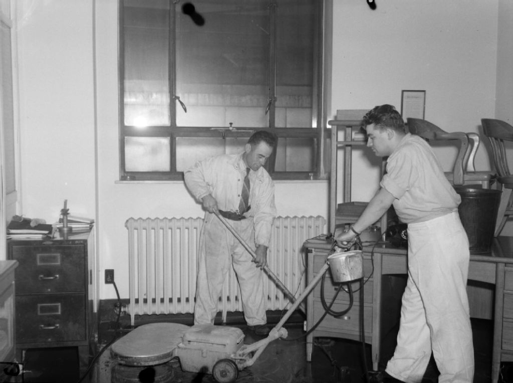Concierges participant au lavage des planchers dans les locaux de l'édifice Sun Life du Canada, rue Metcalfe à Montréal. Nous remarquons un des employés utilisant une polisseuse