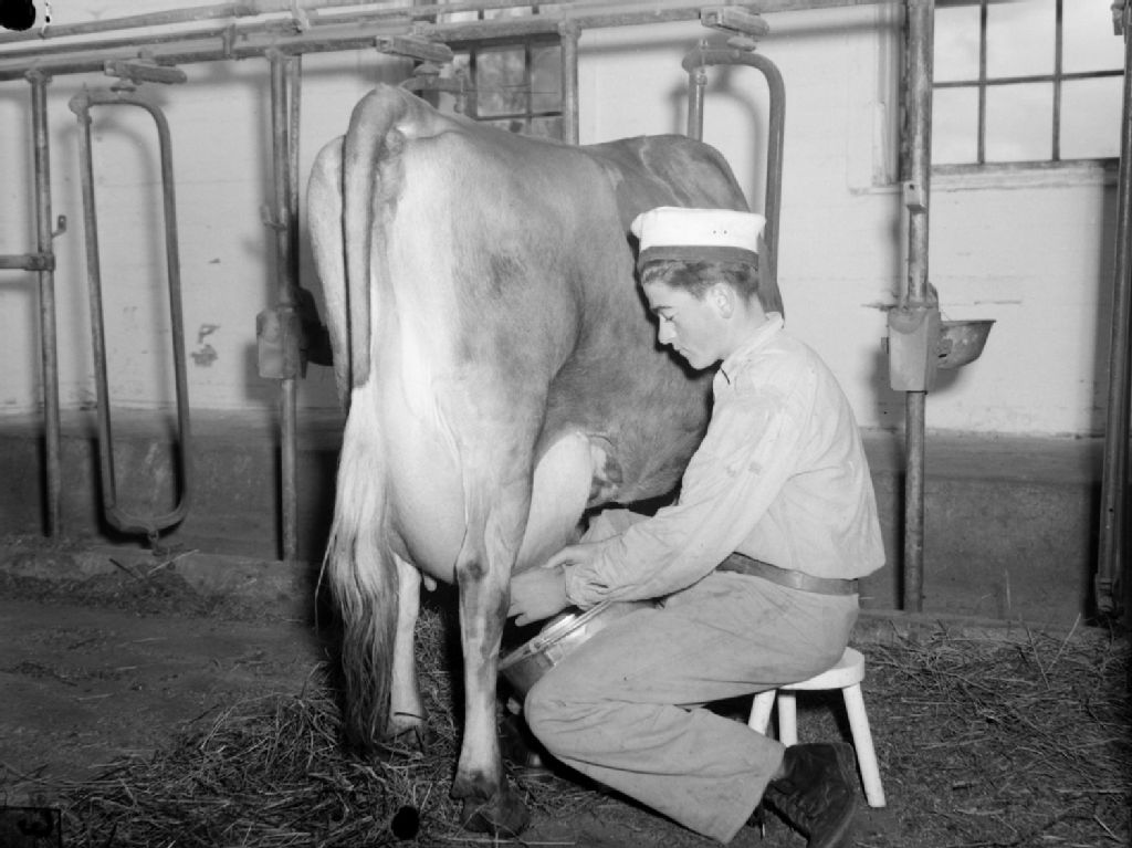 À l'étable, un élève de l'école Boys' Farm and Training School de Shawbridge, trait une vache
