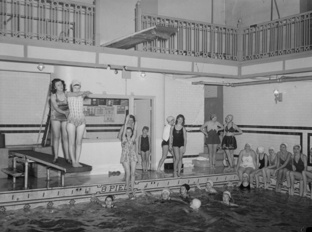Une monitrice de natation de la Société canadienne de la Croix-Rouge enseigne le plongeon aux jumelles Hélène et Jacqueline St-Jean. La piscine se trouve à la Palestre nationale de la rue Cherrier à Montréal