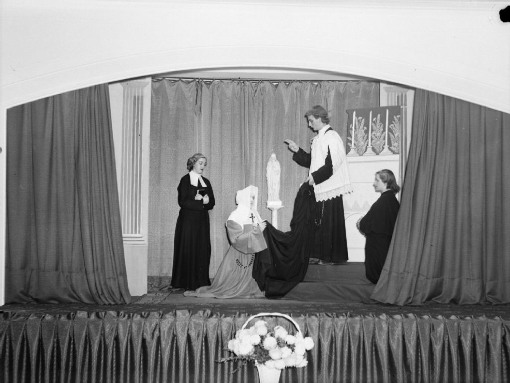 Pièce de théâtre probablement jouée dans le cadre d'une campagne de financement pour l'hôpital Sainte-Justine. Les acteurs campent des personnalités religieuses