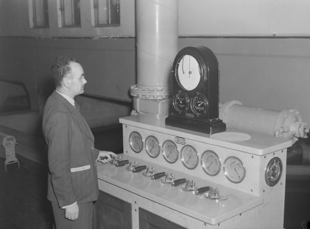 G. Larivée consulte les cadrans de contrôle des filtres de nettoyage. La scène se déroule probablement dans une usine de filtration de l'eau à Montréal