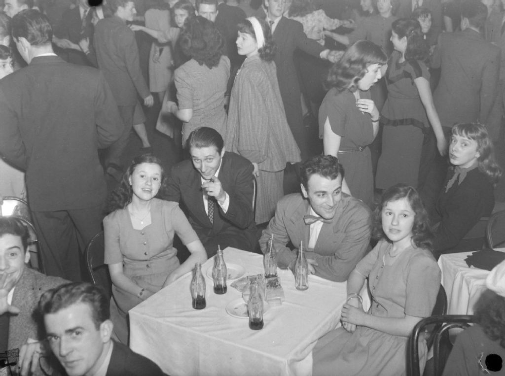 Jacques Normand est assis à la table des jumelles Hélène et Jacqueline St-Jean lors de la soirée dansante animée par des artistes présentée au salon Bleu et or de la Palestre nationale, rue Cherrier à Montréal. Sur la table se trouvent des bouteilles de Coca-Cola.