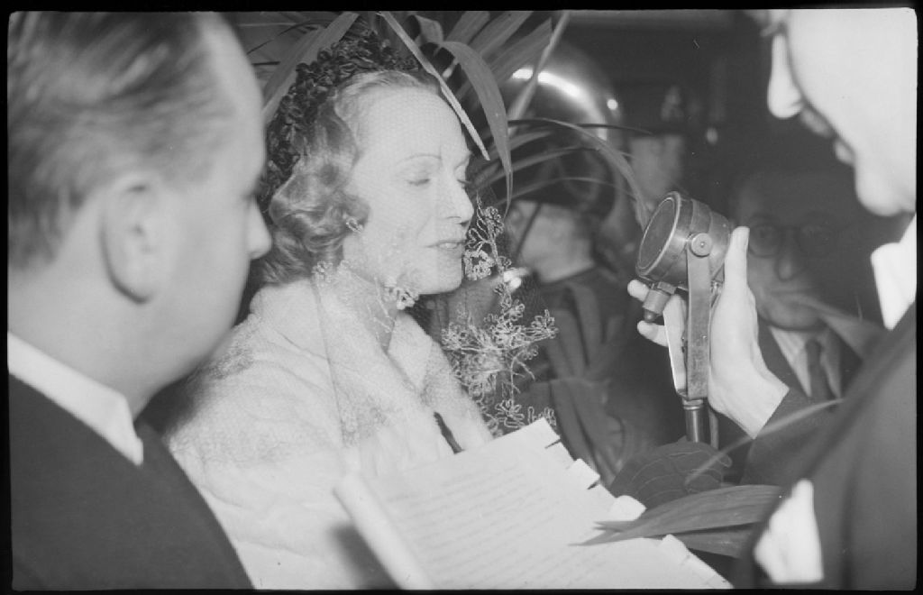 Nous voyons un gros plan de Madame Neagle portant une voilette et répondant à une entrevue devant un micro