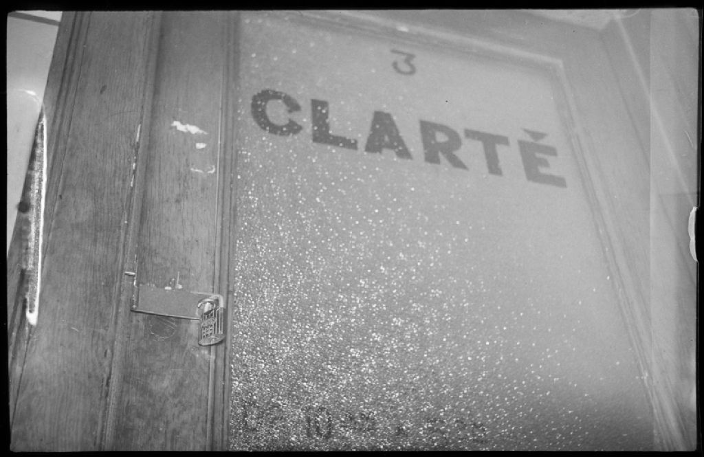 Nous voyons une porte fermée avec un cadenas. Nous remarquons le chiffre 3 et la mention «Clarté». Il s'agit de l'hebdomadaire à tendance communiste dont les locaux étaient situés au 254, rue Sainte-Catherine Est, à Montréal. Il a été fermé à cause de la «Loi du cadenas» promulguée par le Premier ministre Maurice Duplessis dans le but de contrer la propagande communiste