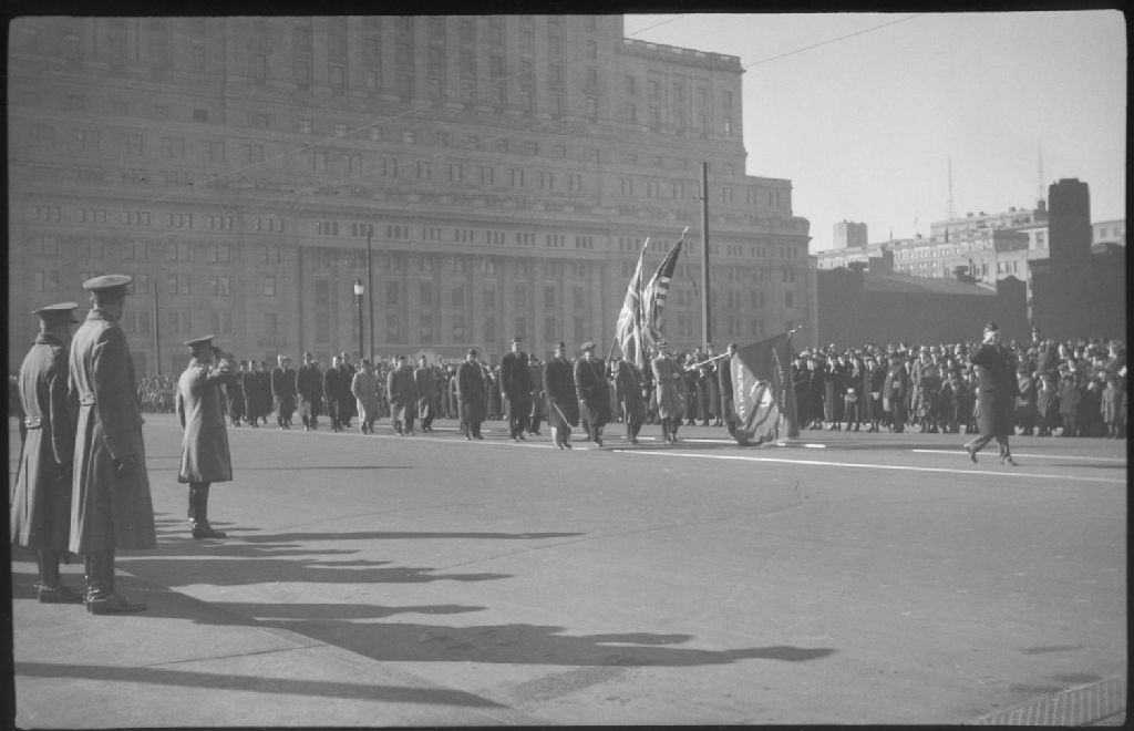 Lors de la cérémonie de l'Armistice à Montréal, à proximité du monument aux Braves situé entre le boulevard Dorchester (devenu René-Lévesque) et la rue Peel, nous voyons une troupe de la «American Legion» défilant avec des drapeaux. Nous apercevons aussi des édifices
