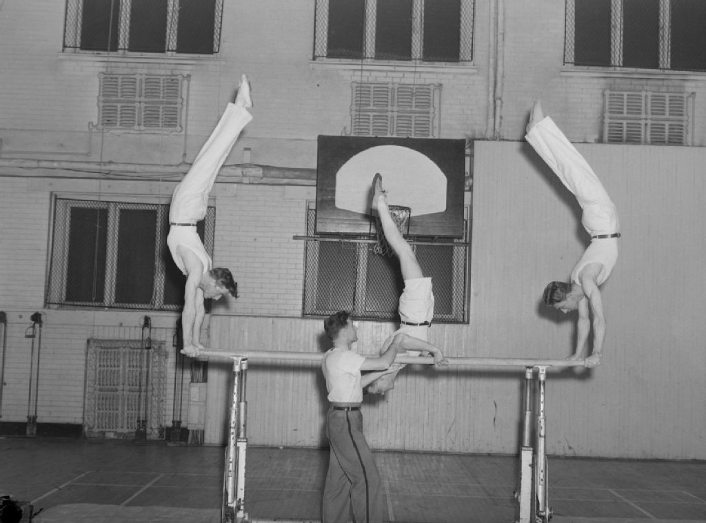 Gymnastes masculins à l'entraînement aux barres parallèles en compagnie de l'entraîneur. La scène a lieu au Young Men's Christian Association (YMCA) de Westmount