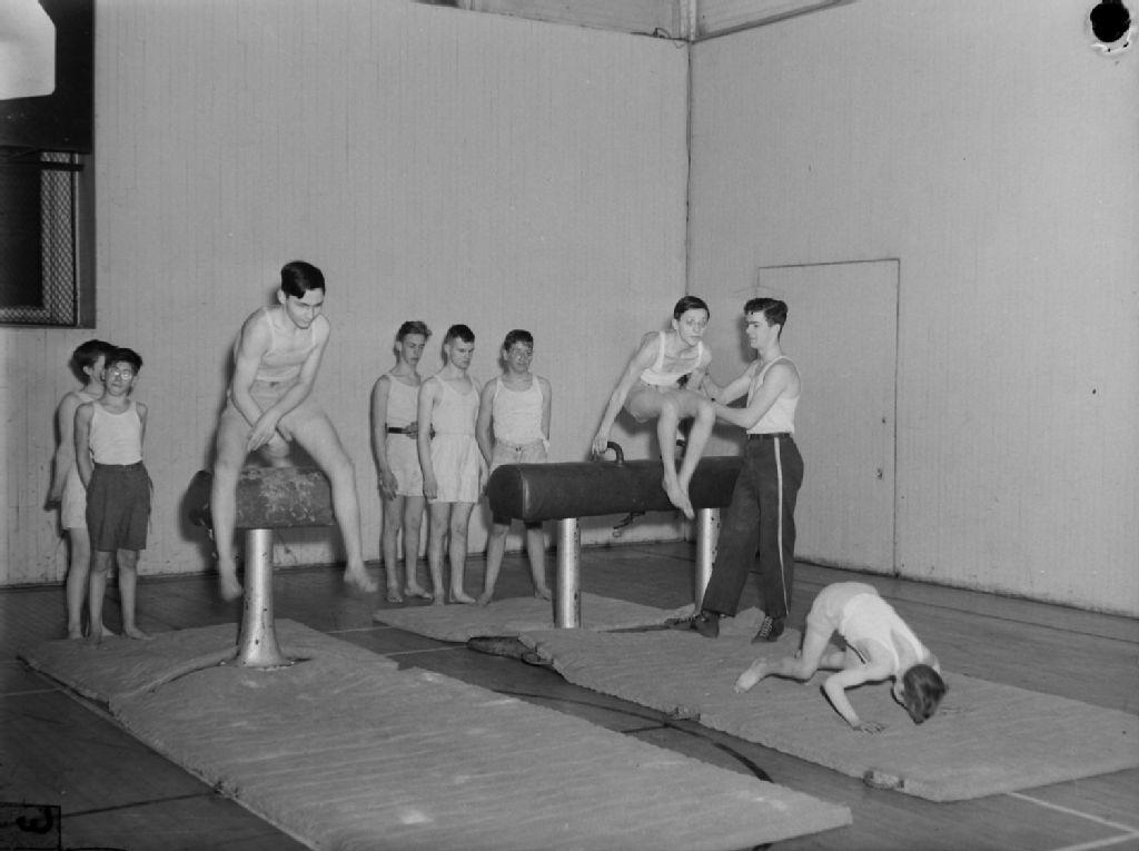 Jeunes gymnastes à l'entraînement au cheval d'arçons. La scène a lieu au Young Men's Christian Association (YMCA) de Westmount