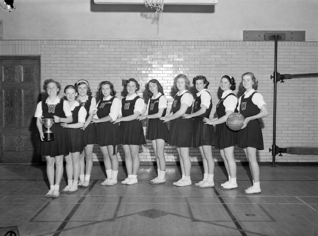 Jeunes filles montrant un trophée couronnant probablement l'équipe de basketball. La scène se déroule au Westmount Junior High School, chemin Academy à Westmount