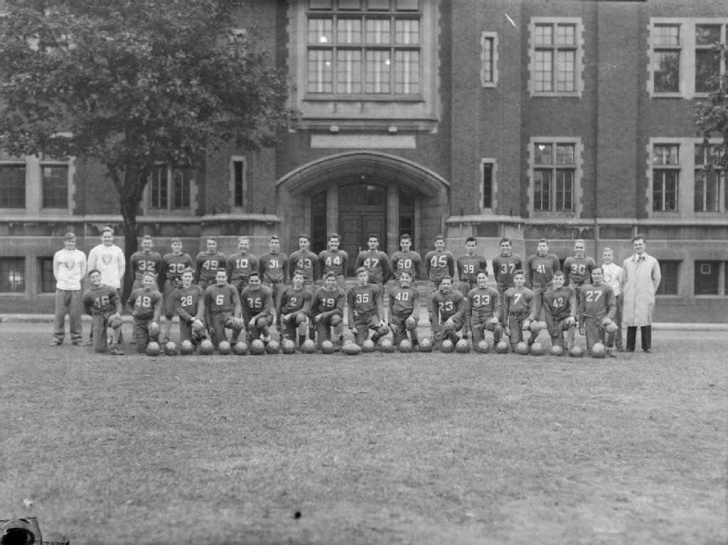 Joueurs et entraîneur de l'équipe de football de l'école Westmount Junior High School située sur Academy Road à Westmount
