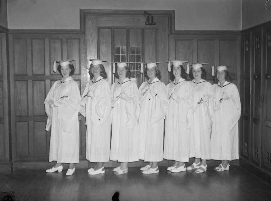 Diplômées de l'école St. Paul's Academy tenue par les Soeurs de la Congrégation de Notre-Dame à Montréal, chemin Côte-Saint-Antoine à Westmount. Il s'agit de la collation des diplômes
