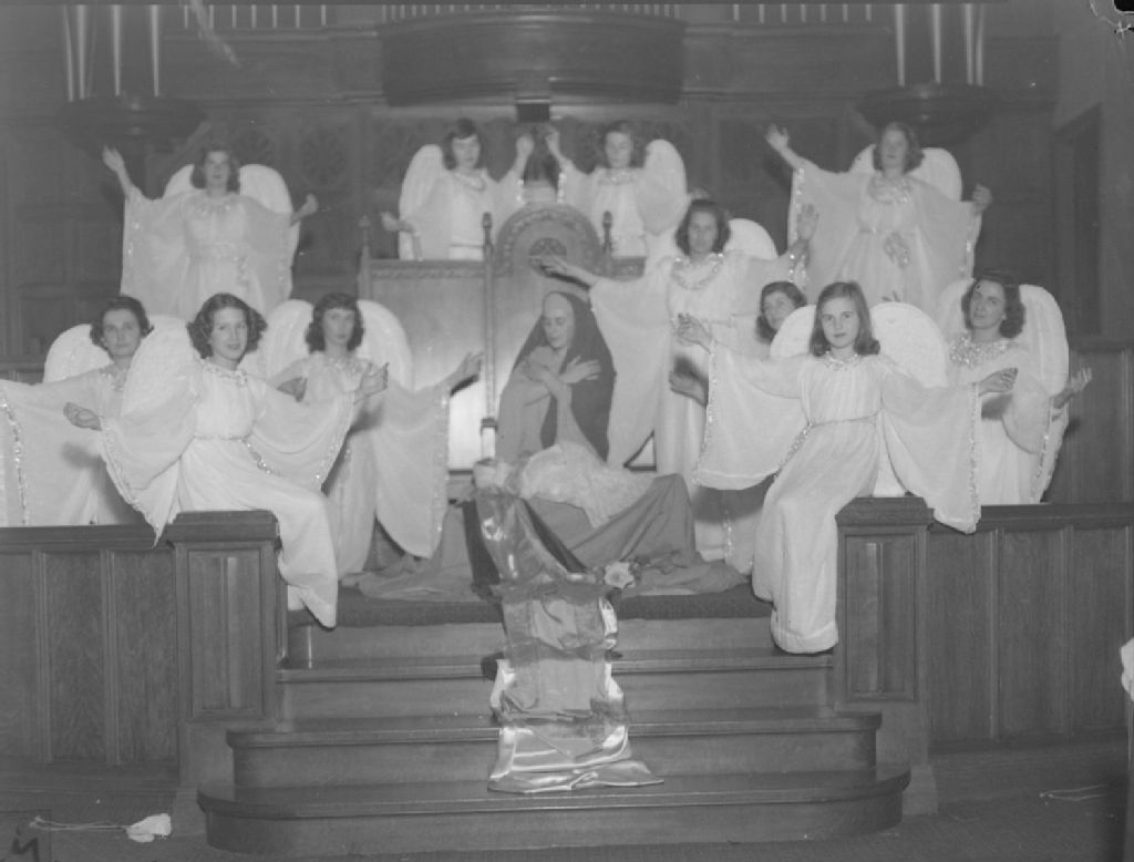 Des anges entourent la Vierge Marie et l'enfant Jésus lors d'une pièce de théâtre à caractère religieux présentée à l'église St. Andrew's United Church située sur le boulevard Saint-Joseph à Lachine